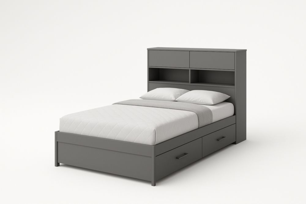 Funzionalità: Due cassetti di stoccaggio e testiera con mensole integrate.