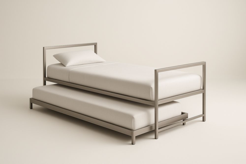 Letto estraibile in acciaio con struttura in acciaio e materassi in schiuma di poliuretano. Dimensioni complessive: 190 cm lunghezza, 90 cm larghezza, 60 cm altezza. Materasso con spessore di 15 cm. Colore principale: Grigio.