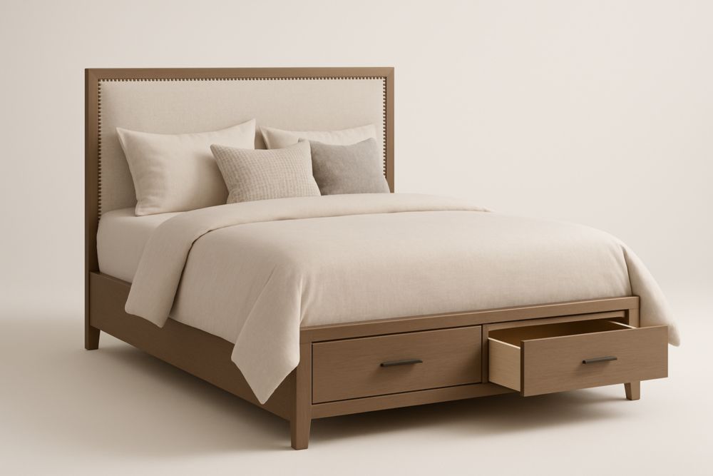 Letto matrimoniale con cassetti integrati in legno massello e tessuto beige